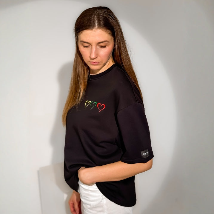 Platus siluetas nevaržo judesių, o švelnus, standesnis trisiūlis audinys suteikia palaidinei formą ir jaukumą. Puikus pasirinkimas tiems, kurie vertina laisvę, kokybę ir prasmingus akcentus savo garderobe.